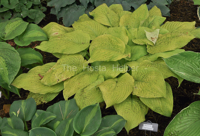 It is the result of a cross of H. 'Newberry Gold' × H. 'Sun Glow' that grows into a medium to large size plant. The ovate