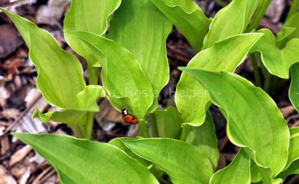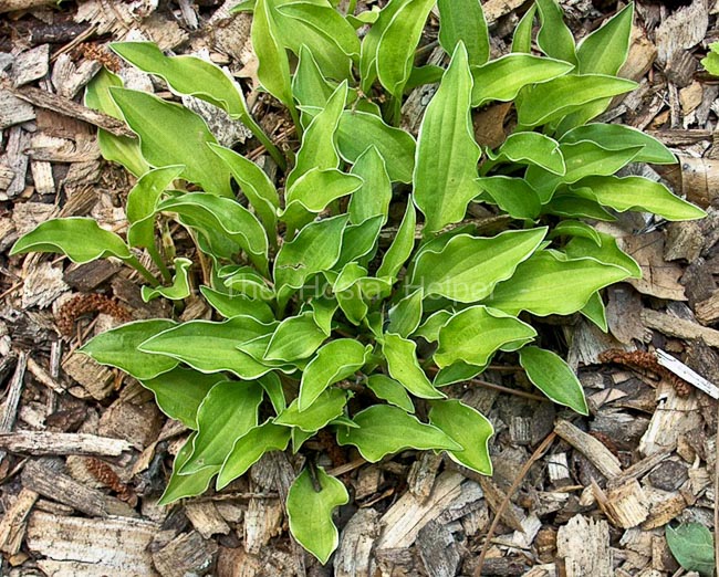 This cultivar is a seedling of H. 'Lakeside Knickknack' which was registered by Mary Chastain of Lakeside Acres Nursery in Tennessee in 2003. It forms a miniature size (5 inches high by 16 inches wide) mound of yellow to chartreuse foliage with a very narrow creamy white marginal variegation. The leaves are slightly rippled and narrowly ovate. In August, it forms purple flowers.
