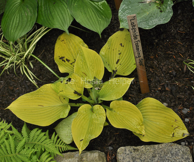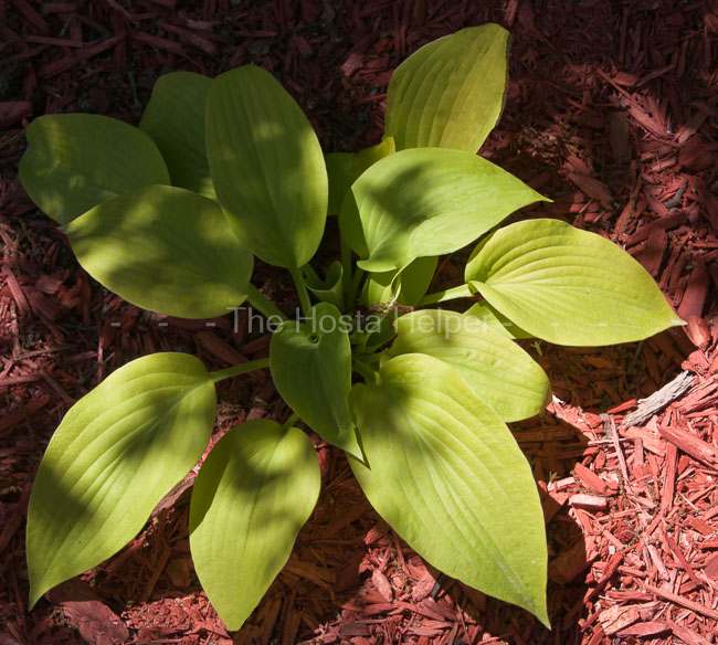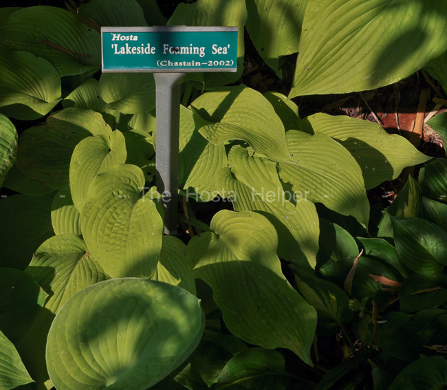 This plant is a cross of an unnamed seedling x H. 'Sun Glow' which was registered in 2002 by Mary Chastain of Lakeside Acres Nursery in Tennessee. It forms large size hosta about 18 inches high with a spread of 46 inches with slightly to moderately corrugated foliage. Pale lavender flowers bloom in July.