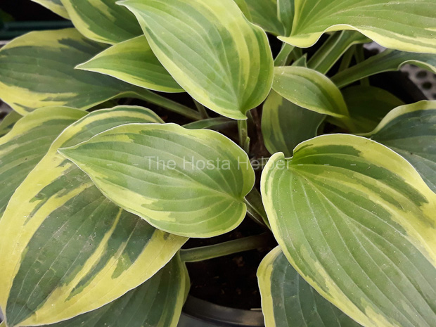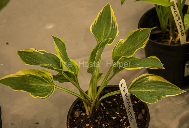 Registered by Mary Chastain of Lakeside Acres Nursery in Tennessee in 2002, this small size (6 inches high by 13 inches wide) cultivar is of unidentified parentage. Its medium blue-green foliage has a creamy white marginal variegation. The leaves are broadly ovate, slightly corrugated and dull on top. It bears tubular shape flowers on scapes up to 14 inches tall.
