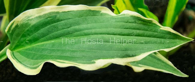 marginal variegation. Its leaves are broadly ovate, serrated, slightly twisted, moderately corrugated and glaucous on top. Pale