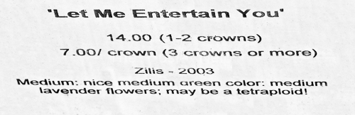 This is a tissue culture sport of H. 'Gypsy Rose' that was registered by Mark Zilis of Illinois in 2003. It is a medium to large size plant which bears lavender flowers in July.