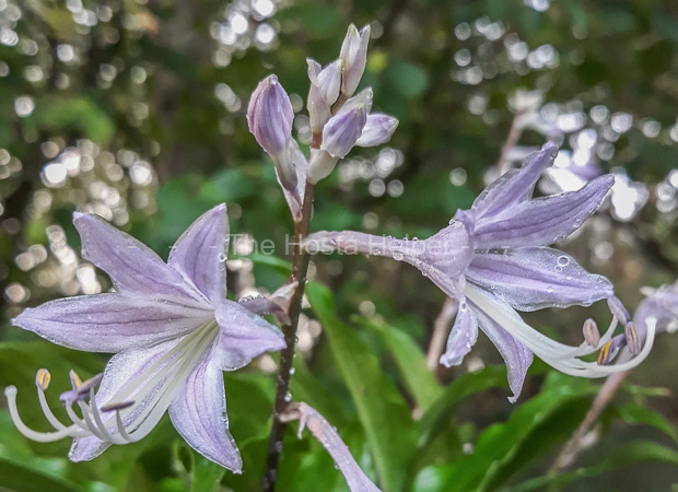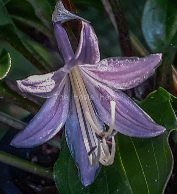 This cross of H. 'Red Sox' × H. 'Wiggle Worms' was was registered in 2004 by Danny Van Eechaute from Belgium. It forms a small size mound of wavy foliage with red spots on the petioles and lavender flowers that bloom in late August.