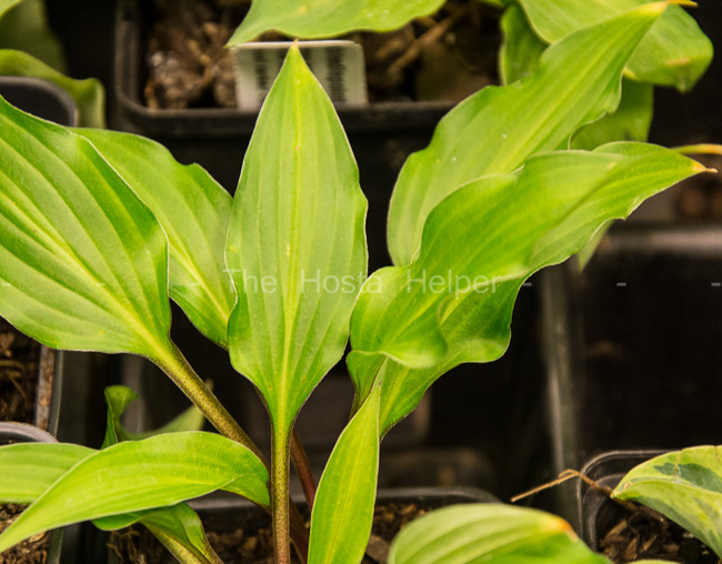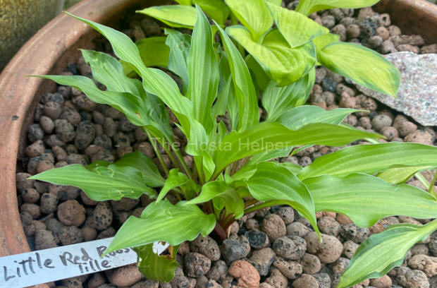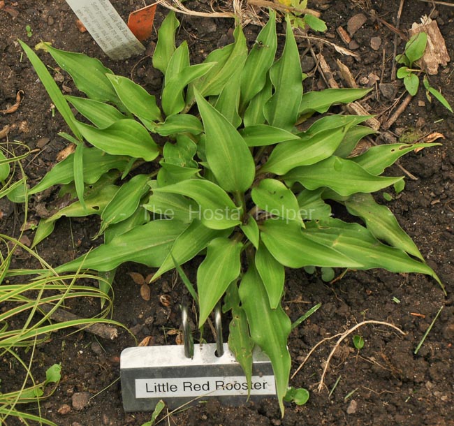 This cross of H. 'Wiggle Worms' × H. 'Red Sox' was registered in 2002 by Danny Van Eechaute from Belgium. It forms a small size mound of wavy foliage with red petioles and lavender flowers.
