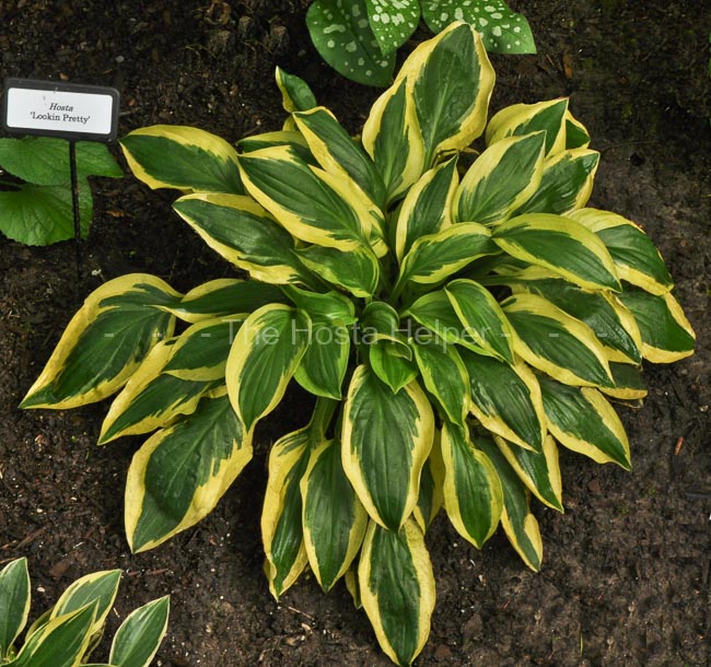 reversed form of H. 'Sitting Pretty'. It forms a small size mound and bears bright purple