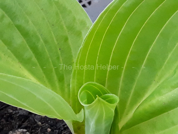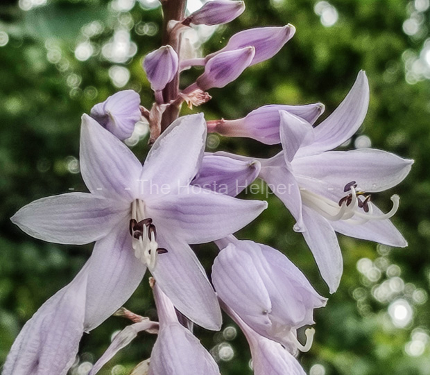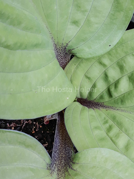 Originated by Louis Vissers of Belgium, this non-registered cultivar is an open-pollinated seedling of H. 'Red Bull'. It is a medium size hosta about 15 inches tall by 30 inches wide. The nearly round leaves are light green, slightly puckered and have purple petioles. Unique flower are near white with the first set of petals having a green stripe.