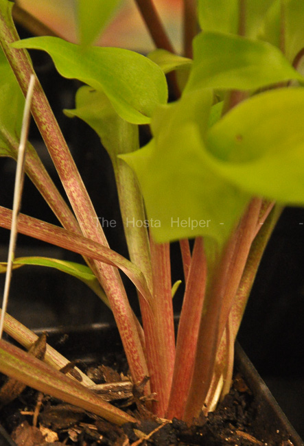 This cultivar was registered by Bob Solberg of Green Hill Farm in North Carolina in 2011. It is a hybrid of H. 'Strawberry Banana Smoothie'. The leaves have wavy edges and red petioles. It is a medium size plant that sets lavender flowers.