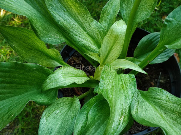 Originated by Hugo Philips of Belgium, this non-registered cultivar is a seedling of H. 'Mito-no-hana'. It is a medium size hosta with creamy-white colored hostas early in the season which add green flecks and spots before turning dark green later. It bears white "rectifolia" type flowers on long scapes.