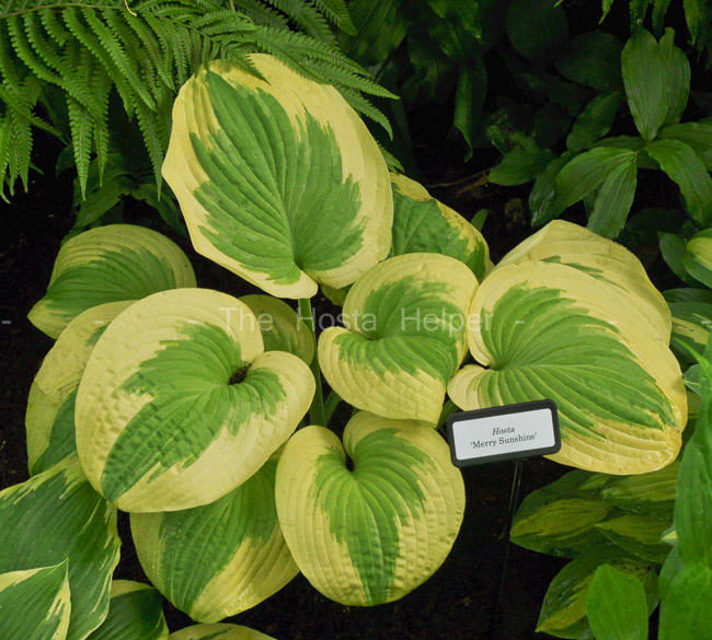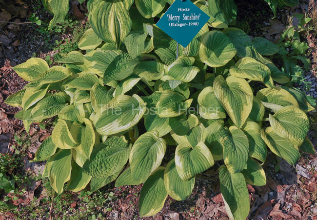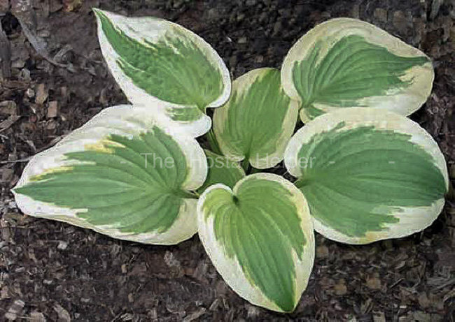 Dr. Ed Elslager of Michigan registered this cross between H. 'Fascination' × H. hypoleuca in 1998. A medium size plant, it has yellow margins that fade to creamy white as the summer progresses. Near white flowers bloom from late June into July.