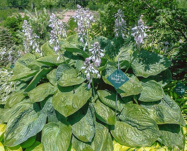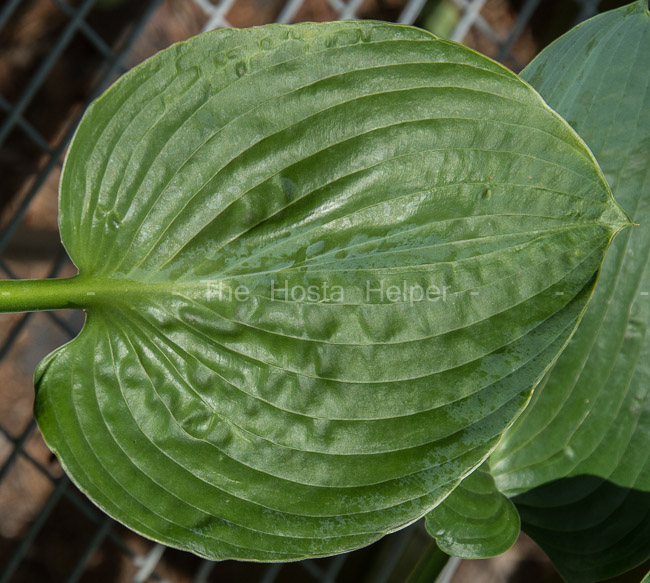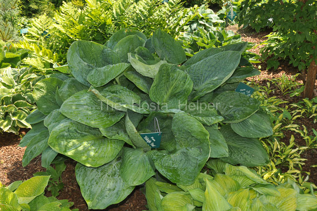 A seed selection of unidentified parentage, this cultivar was registered by Dr. Dick and Jane Ward of Ohio in 2009. The mound of intensely blue-green, cupped, moderately corrugated foliage grows to a giant size about 36 inches in height and 54 inches in width. It bears tubular, very pale lavender flowers from late June.  The leaves turn green later in the summer.