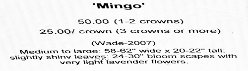 This seedling selection of unidentified parentage was registered by Van Wade of Wade and Gatton Nursery (Closed 2019) of Ohio in 2007 as part of his American Indian Series of hostas. It forms a large size mound 22 inches high by 64 inches wide with ovate, slightly wavy, moderately corrugated foliage. Very pale lavender flowers bloom in large numbers from June into July. It sets viable seeds.