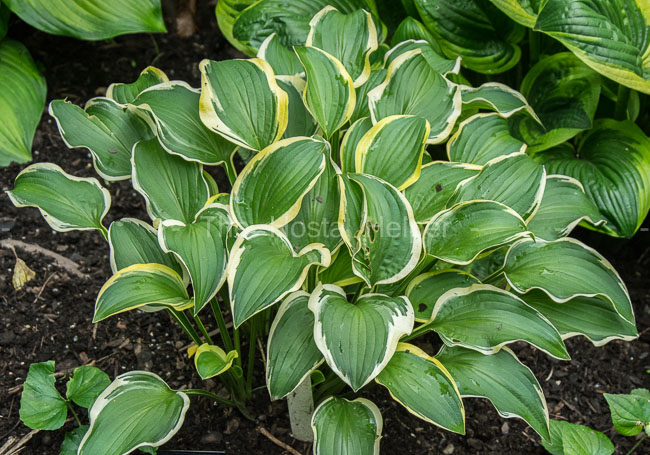 This is a selected form of the species H. sieboldii from an unidentified originator in Japan that was registered by Kevin Walek (Hosta Registrar) in 2009 and re-registered with new data in 2018. It forms a semi-upright mound about 15 inches in height by 35 inches wide. The olive green leaves have a creamy yellow to white marginal variegation and are slightly rippled, dull on the top and bottom and are elliptic with a tapered base. Medium purple, tubular flowers with pale lavender internal strips bloom in August. At the time of registration, seed set was unknown.