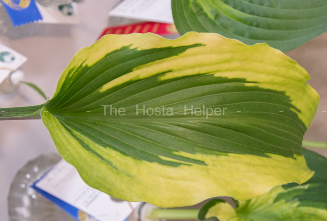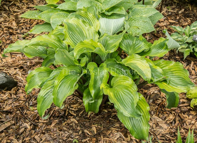 This medium size (15 inches high by 30 inches wide) non-registered cultivar is a sport of H. 'Funky Monkey' from Marco Fransen of Fransen Hostas in the Netherlands. The foliage is green with a golden colored marginal variegation. Its slug resistant leaves are slightly rippled and have red petioles. Lavender flowers bloom in July.