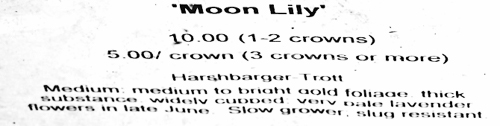 This cultivar of unidentified parentage was registered on behalf of Gretchen Harshbarger by Joyce Trott in 1993. It is a medium size plant with good substance. Very pale lavender flowers bloom from late June into July.