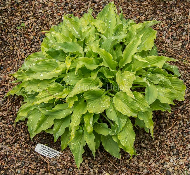 A hybrid of H. minor x H. 'Piedmont Gold', this cultivar was registered by Peter Hall in 1993. The 12 inch high plant spreads to a width of around 33 inches with foliage that emerges gold in color but changes to chartreuse later in the season. Its leaves are distinctly rippled and twisted at the tips. Pale lavender flowers bloom in July.