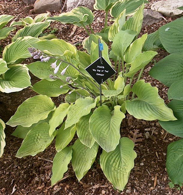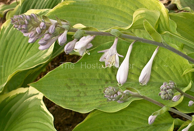 Registered by Dr. Ed Elslager of Michigan in 2002, this cultivar is a cross between H. 'Sea Prize' × H. 'Maekawa'. The plant forms a medium size (18 inches high) mound of moderately wavy, cupped foliage. It bears pale lavender flowers on top of reddish purple scapes in July.