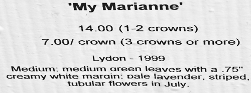 This cultivar is a cross between H. 'Amy Aden' × H. 'Filagree' was registered by Patrick Lydon in 1999. It is a medium size plant with ovate, wavy foliage. The pale lavender flowers bloom in July. It has a good growth rate.