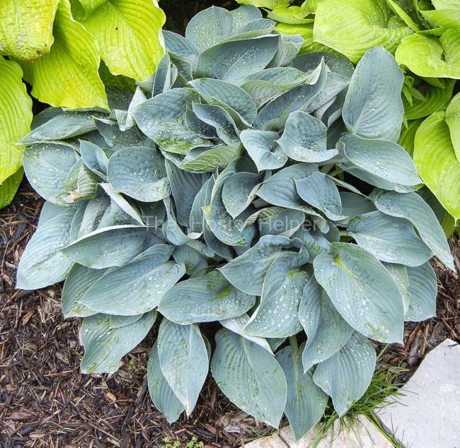 blue-green, broadly ovate, slightly wavy and dull on top.