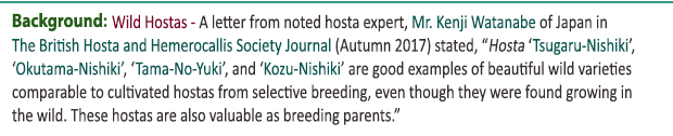According to The Hostapedia by Mark Zilis (2009), "This turned out to be one of the most beautiful hostas that I observed during a three-week trip to Japan in 1991."