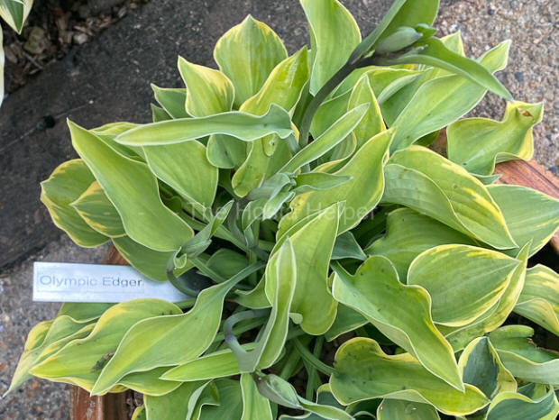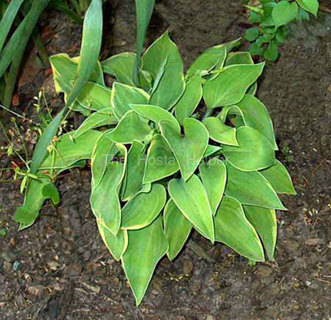 This sport of H. 'Gold Edger' has a thin, creamy marginal variegation. It was registered by Naylor Creek Nursery of Washington in 1999. It forms a  medium size (13 inches high)  mound with slightly wavy, slightly corrugated foliage with average substance. The medium lavender flowers appear from late June into July.