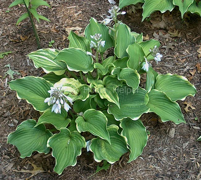 Registered by Dr. Jim and Sandy Wilkins of Michigan in 2002, this plant is a hybrid of an unnamed seedling and H. 'Rhapsody in Blue'. It is medium size (14 inches high) plant that has near white flowers in August.