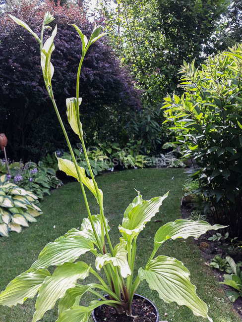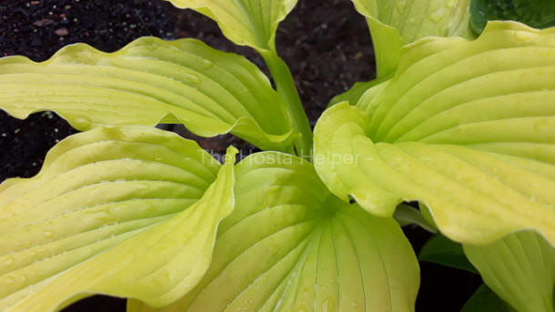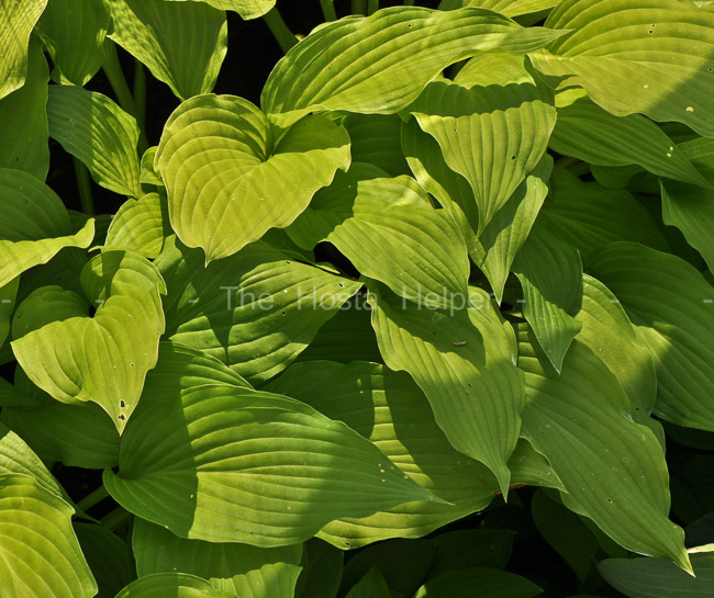 A non-registered cultivar of unidentified parentage, this plant is from Dr. Ullrich Fischer of Germany. It forms a medium size hosta about 17 inches tall that spreads about 46 inches wide. The leaves are elliptic when young and ovate at maturity. They are rippled with a whitish shine on the underside and are of average substance. The petioles are a reddish color on the lower end. Pale lavender flowers bloom on tall scapes.