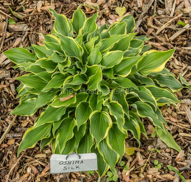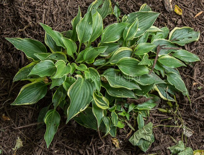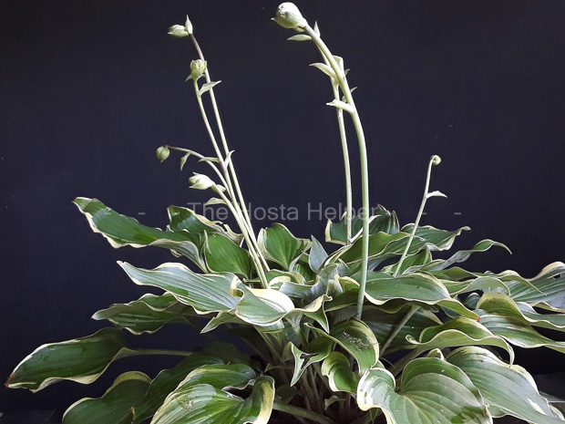 This cultivar is a seedling of H. pycnophylla x an unnamed seedling which was originated in Japan by Toshiro Shimizu and registered on his behalf by Mark Zilis of Illinois in 2009. The medium size plant grows to about 12 inches in height with a spread of around 25 inches. Its leaves are slightly rippled, flat, dull on top. They are medium green with pure white marginal variegation. Pale purple flowers bloom from mid-August into October.