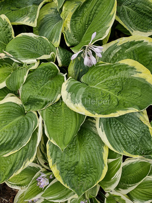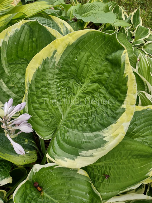 This non-registered cultivar is a sport of H. 'Blue Umbrellas'. It has green foliage with yellow marginal variegation.