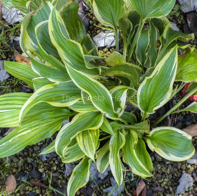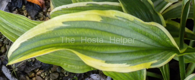 Another of the many hybrids of H. 'Zany Janie' × an unidentified hosta, this medium size (14 inches