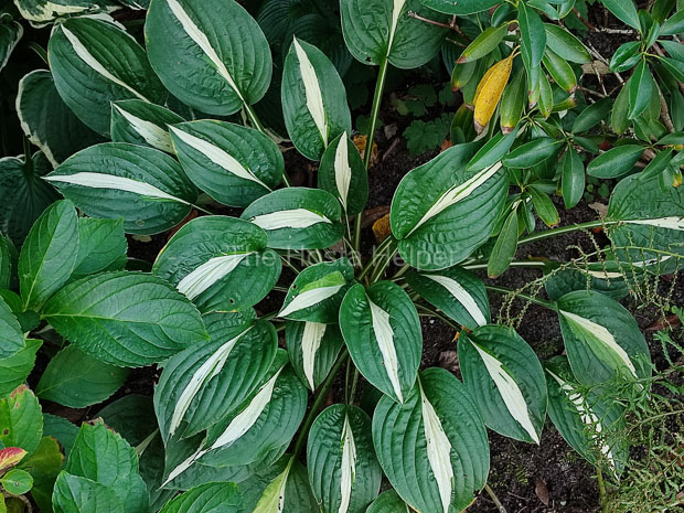 This sport of H. 'Kiwi Full Monty' was registered by Danny Van Eechaute of Belgium in 2010. It is a large size plant about 19 inches high with a spread of around 29 inches. The foliage is medium blue-green with a pure white medial (center) variegation. Its leaves are ovate, flat and has a glaucous bloom on top. Pale lavender flowers bloom from mid-July into August.