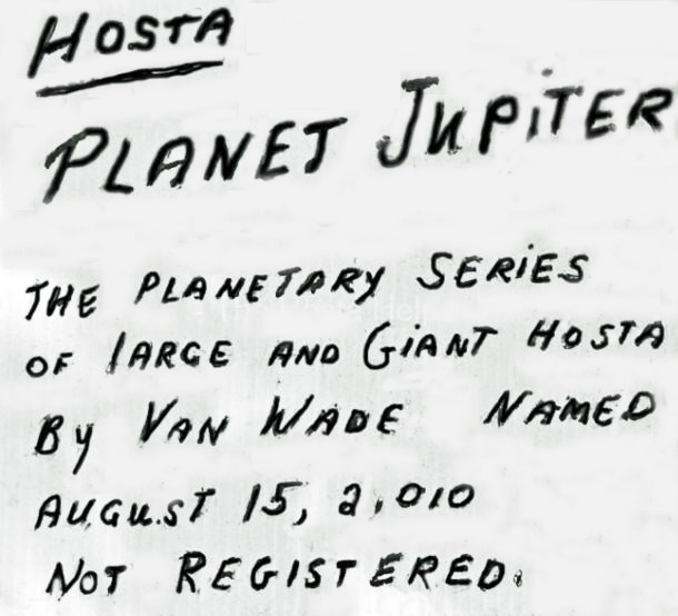 The only information we have appeared on the accompanying sign shown below. This a hosta originated by Van Wade of Wade and Gatton Nursery (Closed 2019) of Ohio. It is part of a small series with the names of planets.
