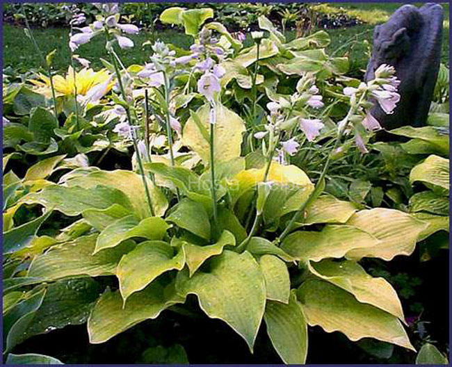 This is a large size hosta with yellow leaves and pale lavender flowers on tall scapes. It is a non-registered cultivar originated by Ron Livingston of Michigan.