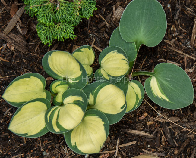 reports 'Pure Heart' and 'Desert Mouse' are the same hosta. Also, 'Holy Mouse Ears' comes up with plain blue-green leaves; after a month or so, a