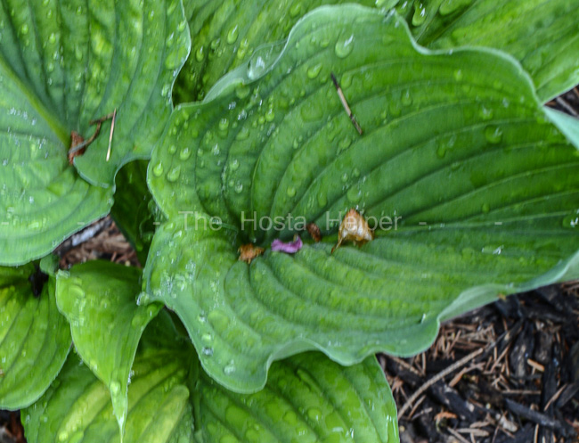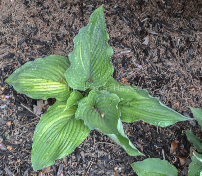 Flowers' × an unidentified hosta in 2014. The medium green foliage has