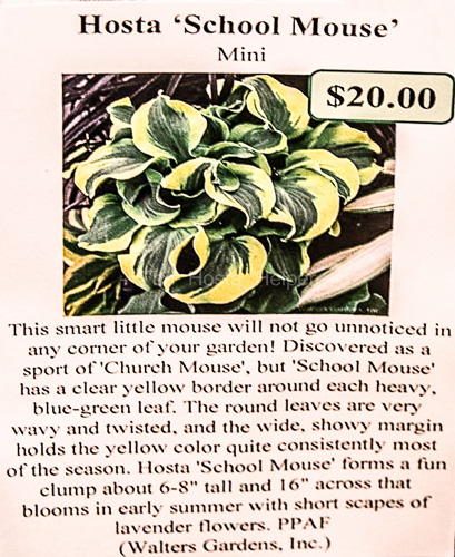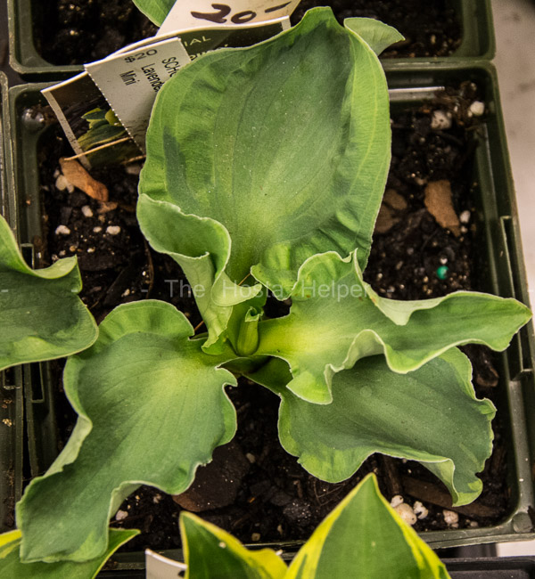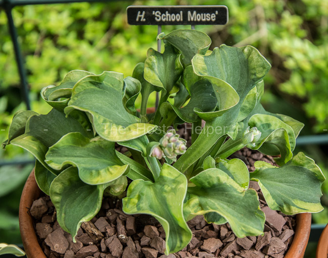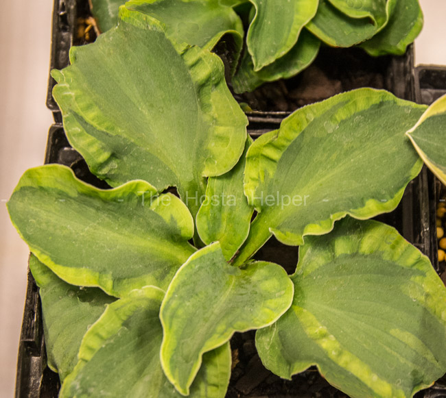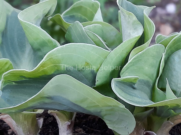 This non-registered but patented, small size (8 inches high by 14 inches wide) hosta was originated by Hans Hansen at Walters Gardens, Inc. of Michigan. It is a tissue culture sport of H. 'Church Mouse' with wavy blue-green foliage that has a wide creamy yellow marginal variegation. In July, it bears clusters of pale purple flowers but is sterile so does not produce seeds.