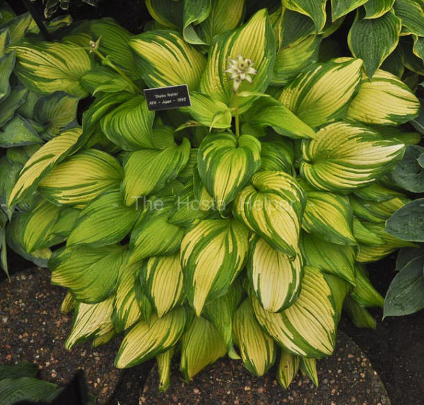 The Hosta Handbook by Mark Zilis (2000), "...foliage is similar to 'Choko Nishiki', but not as streaky as 'Shuho