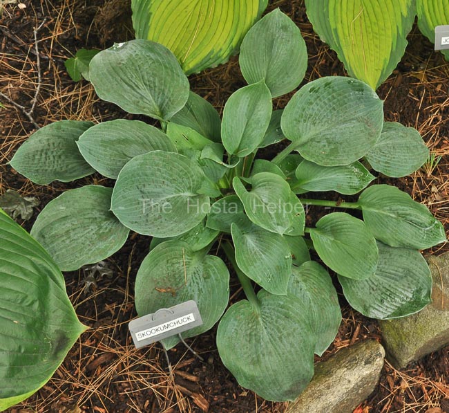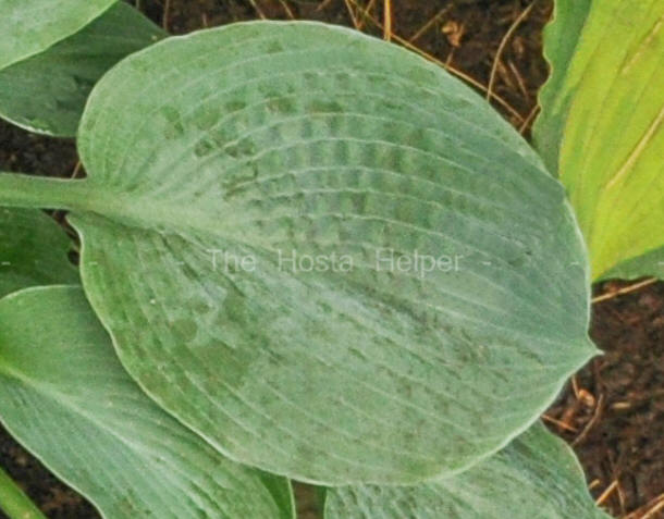 Robyn Duback registered this cultivar with H. 'Sieboldiana' in its background in 1998. It grows to around 20 inches in height and 4 feet wide. The leaves are broadly ovate, cupped and have thick substance. Its near white flowers bloom from late June.