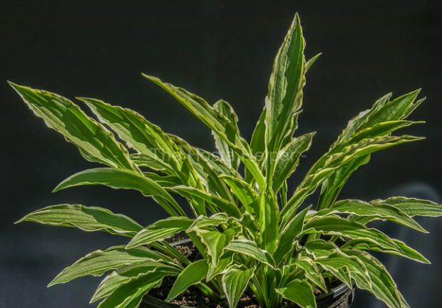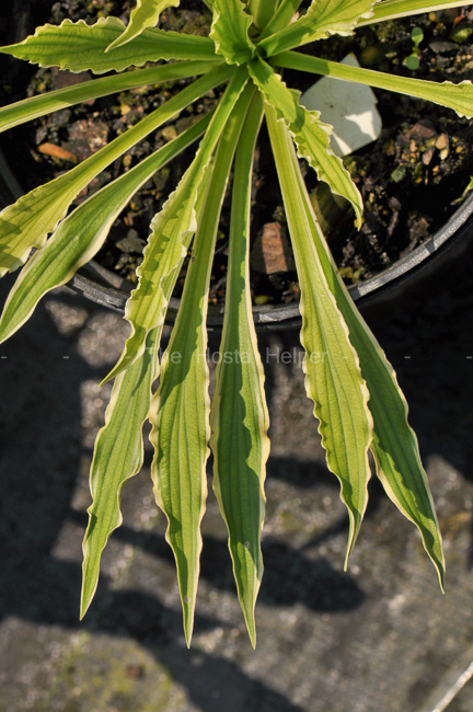 "If this lance-leafed hosta continues to be as vigorous as it seems now, it will emerge as a great border plant, suggesting the look of a variegated liriope. Growing to a height of twelve inches, the green leaves edged in gold form a wonderful clump."