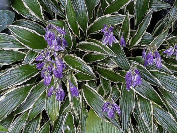 This cultivar forms a neat, medium size (12 inches high by 24 inches wide) mound and has heavily rippled leaves with a narrow white marginal variegation. It was registered by Paul Aden of New York in 1987 as a cross between H. 'Amy Aden' × H. pulchella 'Kifukurin Ubatake'. It has purple flowers in August followed by viable seeds.