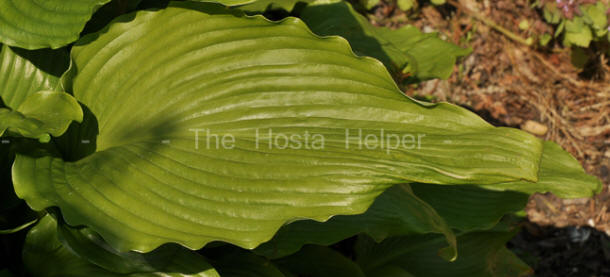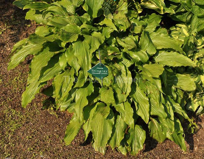 A large size hybrid of H. kikutii x H. montana, this cultivar was registered by Roy Herold of Massachusetts in 2000. It forms a semi-upright clump of heavily rippled foliage. The whitish flowers bloom from late July.