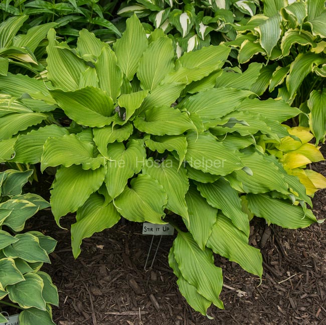 growing, light green hosta with dark reddish purple