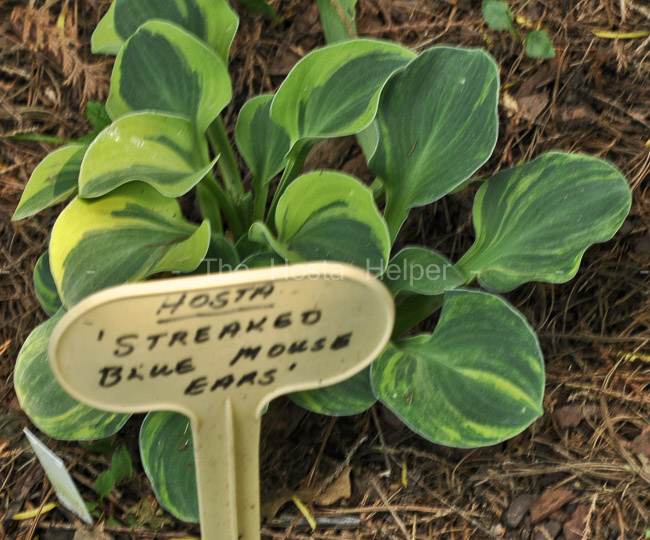 We don't know the origin of this plant but from the name, it should be safe to say that it is a streaked version of H. 'Blue Mouse Ears'...duh. If that is true, it should be a miniature size hosta that bears clusters of pale purple flowers in July.