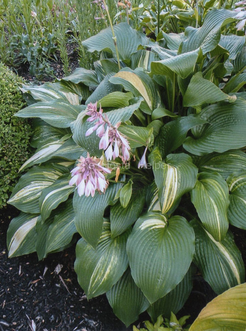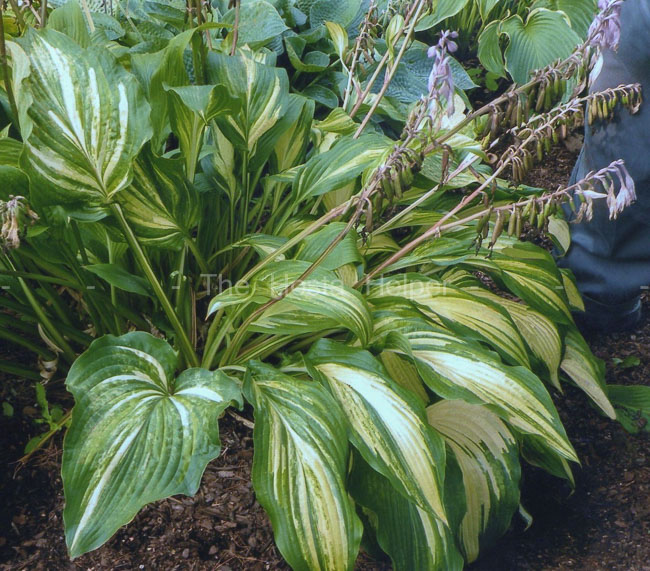 Registered by Dr. Dick and Jane Ward of Ohio in 2009, this medium size (14 inches high by 30 inches wide) cultivar is a sport of H. 'Zany Janie'. It has green foliage with a green and yellow streaked variegation. The leaves are broadly ovate, moderately wavy and dull on top with streaked petioles. Tubular flowers bloom from mid-July into August on scapes 35 inches tall followed by green streaked seed pods.