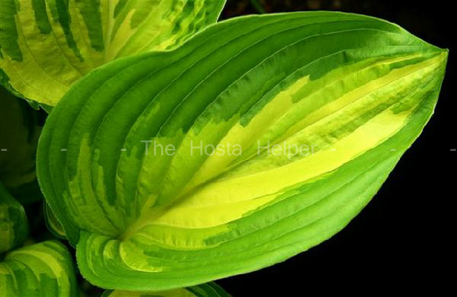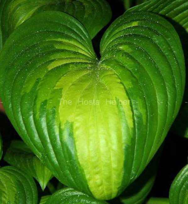 size hosta with shiny dark green leaves and wide, creamy yellow medial