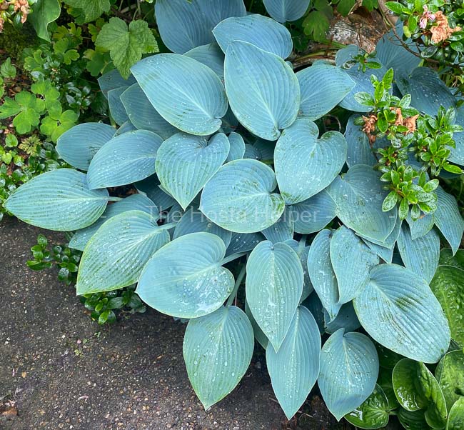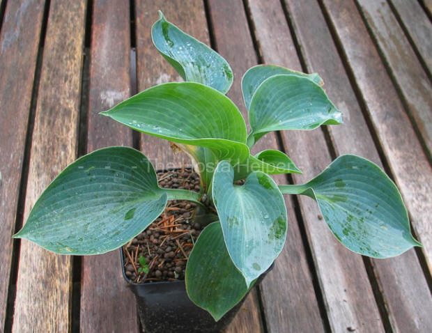 This slow growing plant forms a medium size (18 inches high by 44 inches wide) clump of blue-green foliage that is heavily corrugated, slightly cupped with thick substance. This type bears dense clusters of near-white flowers from late June into July.