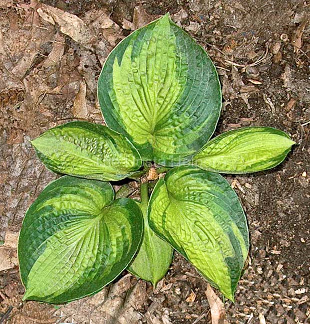 This cultivar from Japan was originated by Dr. Fumio Maekawa and registered by The American Hosta Society on his behalf in 1987 as a sport of H. 'Tokudama'. It is a medium size plant with blue-green foliage that has a gold colored medial (center) variegation. The leaves are heavily corrugated and broadly ovate. It bears near white flowers in dense clusters from late June into July.