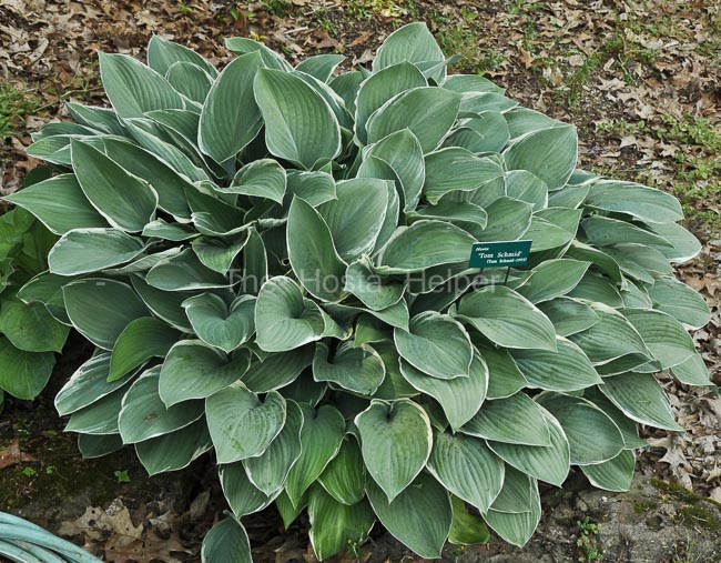 This sport of H. 'Krossa Regal' was registered by Tom Schmid of Michigan in 1995. It forms a large size (25 inches high by 36 inches wide) upright mound with slightly wavy, smooth textured leaves with good substance. Medium lavender flowers are borne on tall (3 to 5 feet tall) scapes from late July into August. It does not produce seed.