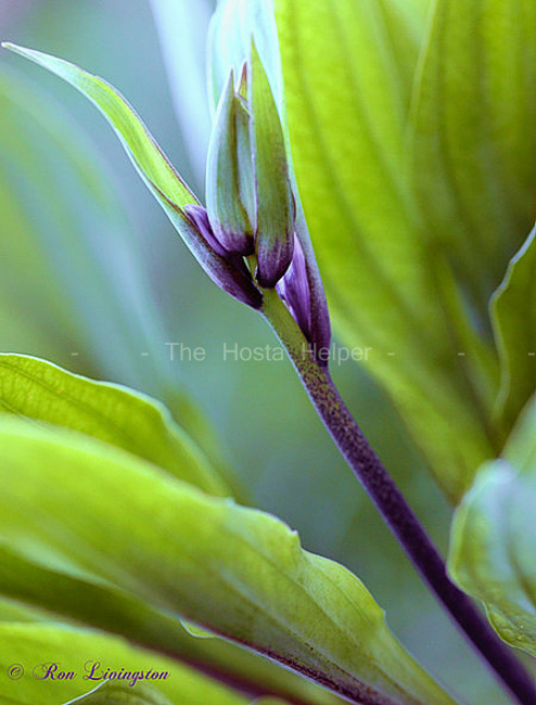 A very upright growing, medium size hosta with narrow, wavy, light green leaves. It has dark red petioles and flower scapes, this non-registered cultivar was originated by Ron Livingston of Michigan.