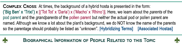 This plant is the result of a cross of H. 'Chartreuse Wedge' with a hybrid of H. nigrescens x H. 'Blue Vision'. It was registered by Paul Aden of New York in 1978. It is a giant size plant about 30 inches tall by 51 inches wide with arching foliage. The leaves are blue-green, broadly ovate and have a distinct tip. Near white flowers bloom in July followed by viable seeds.