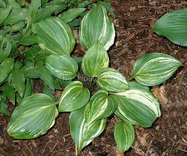This seedling selection is a cultivar introduced by Dr. Ralph (Herb) Benedict of Michigan which was registered on his behalf by Rod Kuenster of Iowa in 2010. It forms a small size (10 inches high by 20 inches wide) mound medium green foliage that has yellow and greenish white streaked variegation. The leaves are broadly ovate and very shiny on top. Its flowers bloom from mid-August into October on scapes 18 to 24 inches tall followed by streaked seed pods.